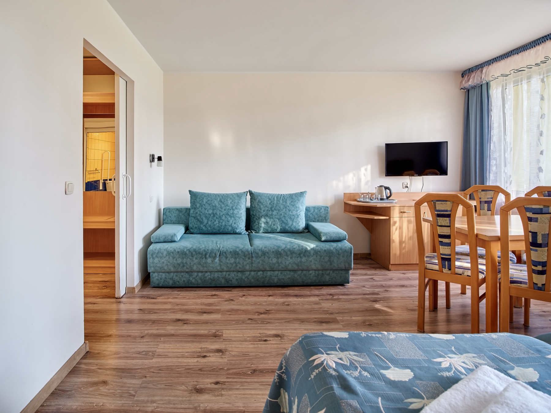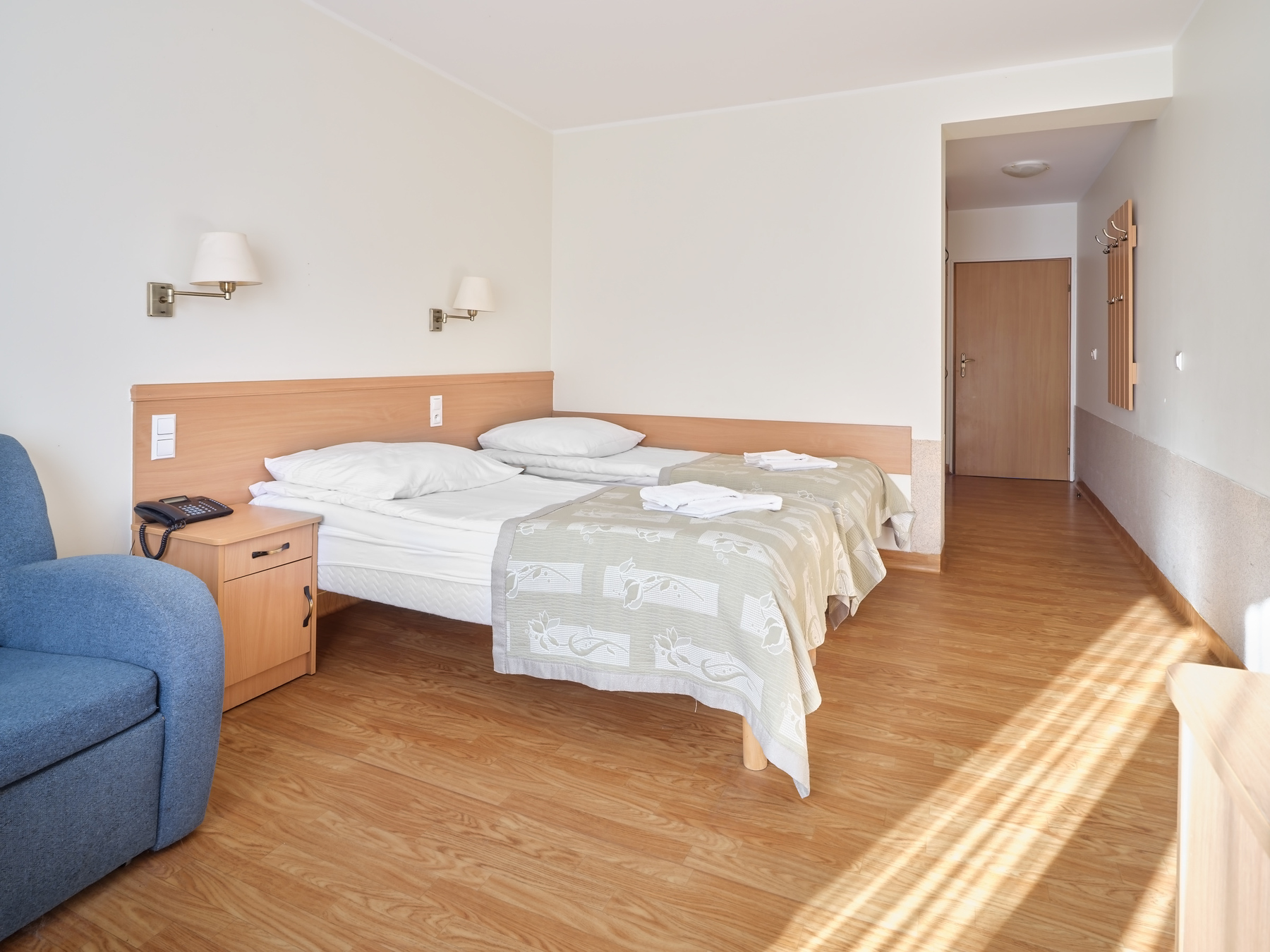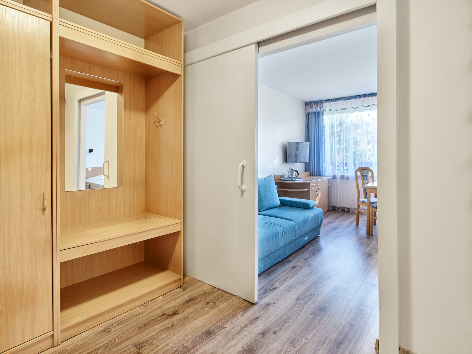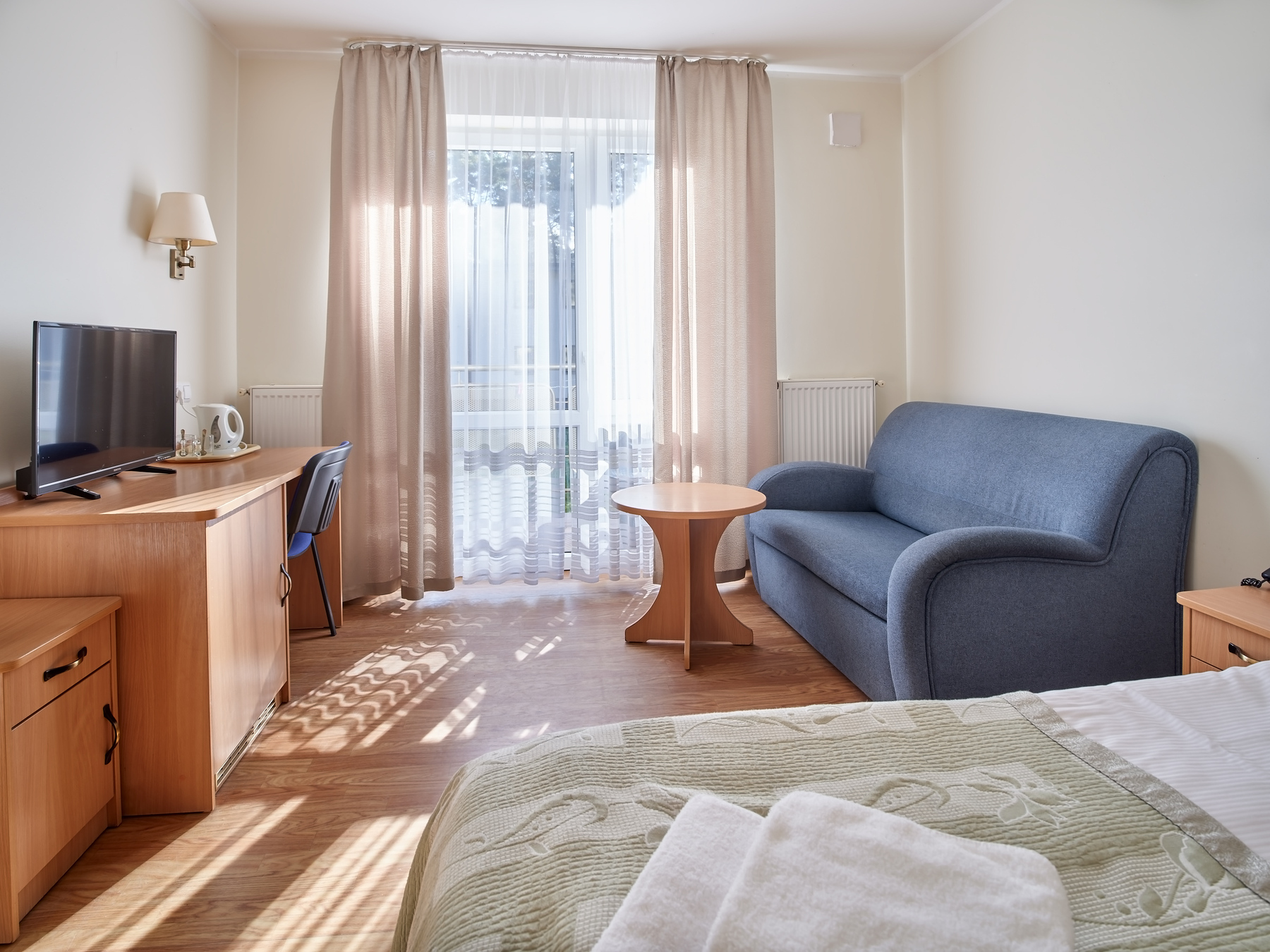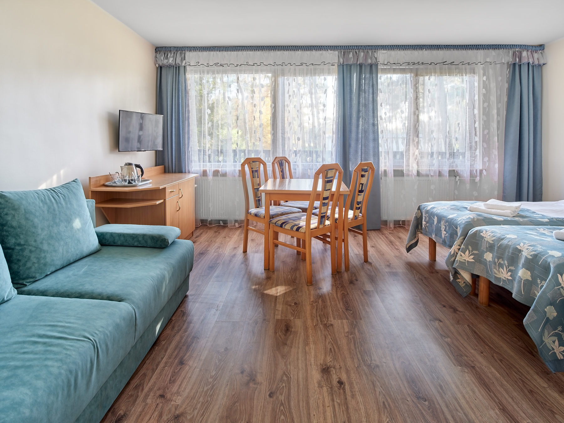 2-osobowe typu Standard i pokoje Premium z oknami na stronę południową; wszystkie wyposażone w łazienki, TV, ręczniki, czajnik, (leżaki do wypożyczenia odpłatnie), koce plażowe, parawany, lodówka w pokoju Premium.